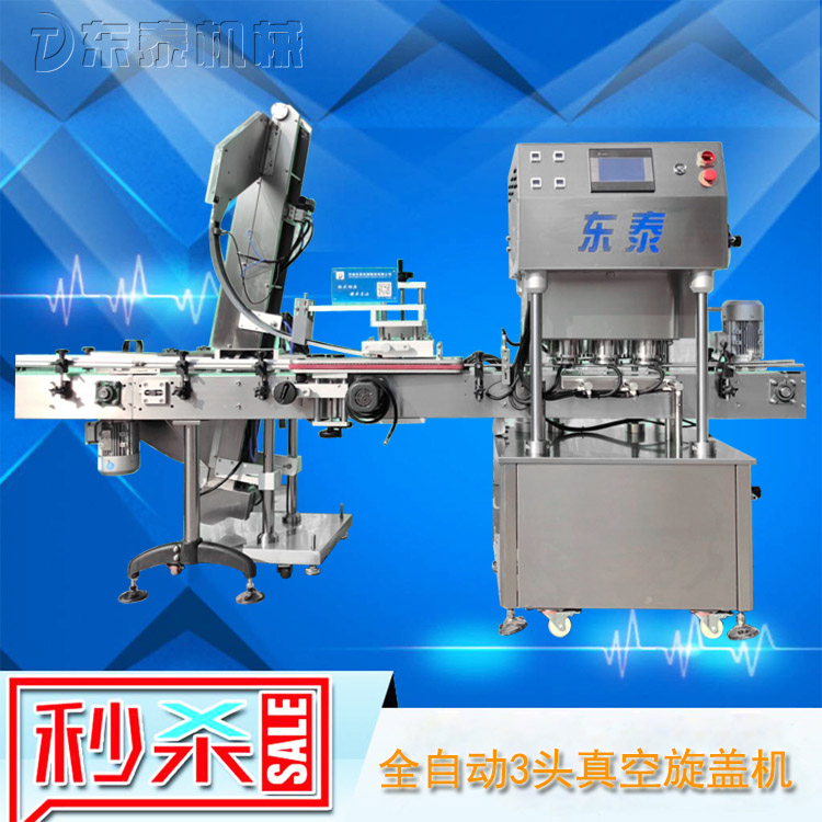 该直线式真空旋盖机是东泰机械结合用户使用的情况,摒弃了传统转盘式真空旋盖机的弊端,研制开发的新型高效设备,设备自动检测到两个瓶子盖子进入到双头真空旋盖机内,旋盖机彩色显示屏会实时显现旋盖状况,整机多点检测,当进口无瓶无盖、出口堵塞、定位不准、瓶身倾倒均自动停机。单个旋盖头达到的真空度都可以单显示,单调整