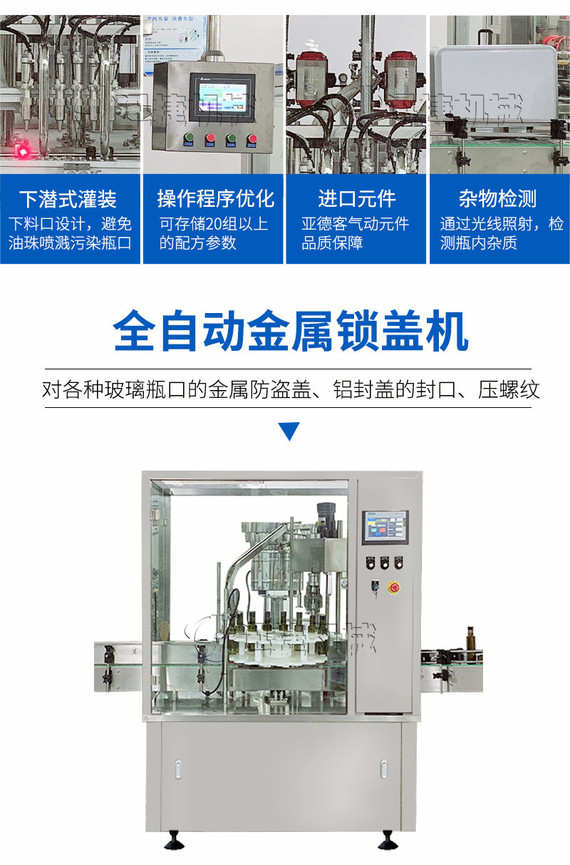 本设备适用于医药、农药、食品、化妆品、化工等行业,主要针对各种玻璃瓶口的金属防盗盖、铝封盖的封口、压螺纹等。该设备可单机使用,也可以与灌装机等设备组成生产流水线自动作业;