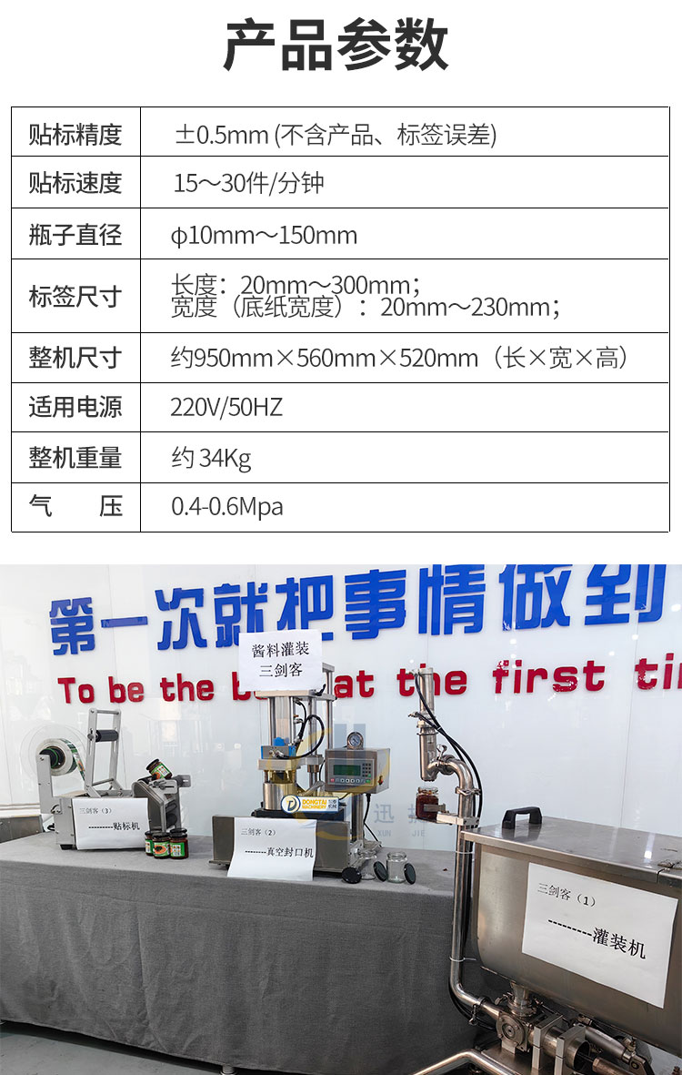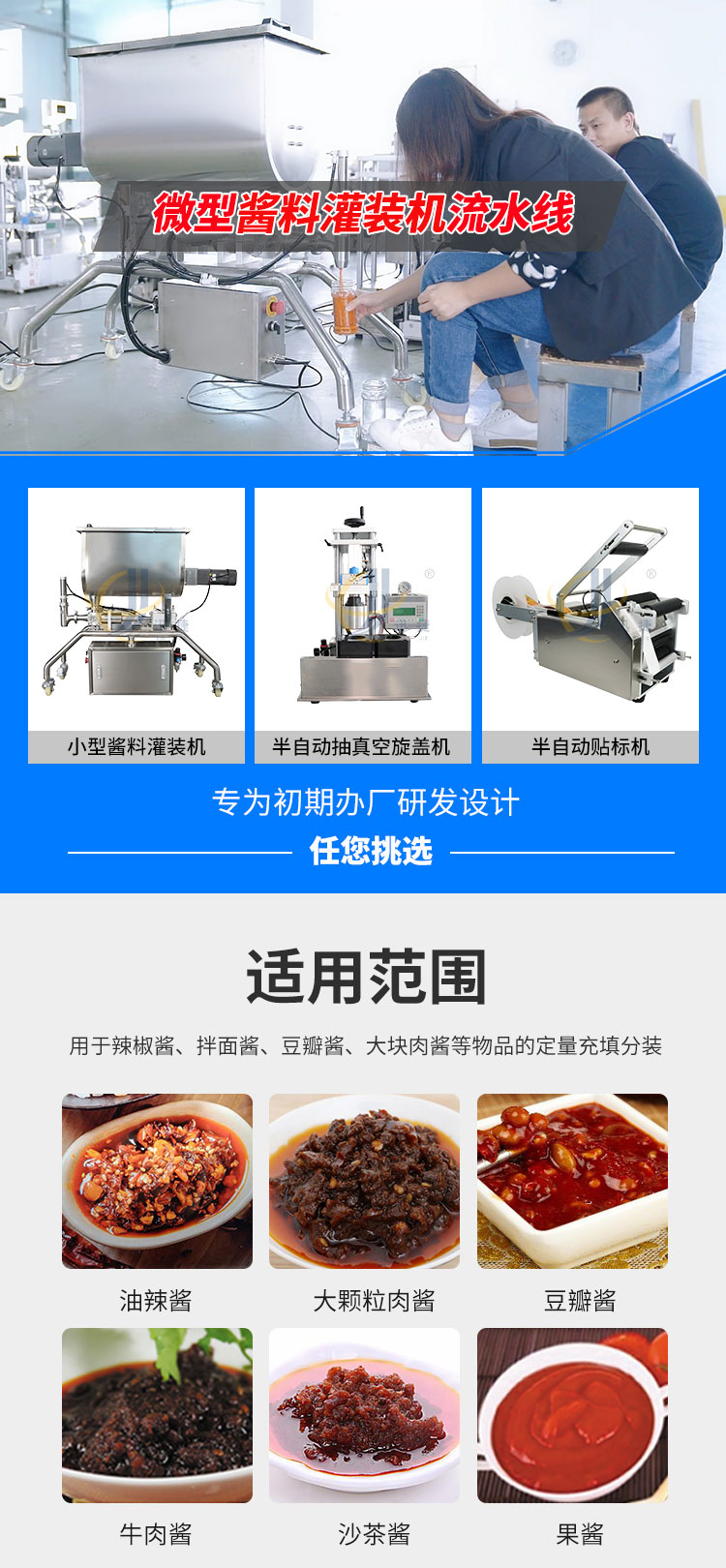 小型酱料灌装生产线又名酱料灌装三??停砂胱远戳瞎嘧盎?半自动真空旋盖机+半自动圆瓶贴标机组合而成。该灌装机适用于辣椒酱、豆瓣酱、大块肉酱等物品的定量充填分装。