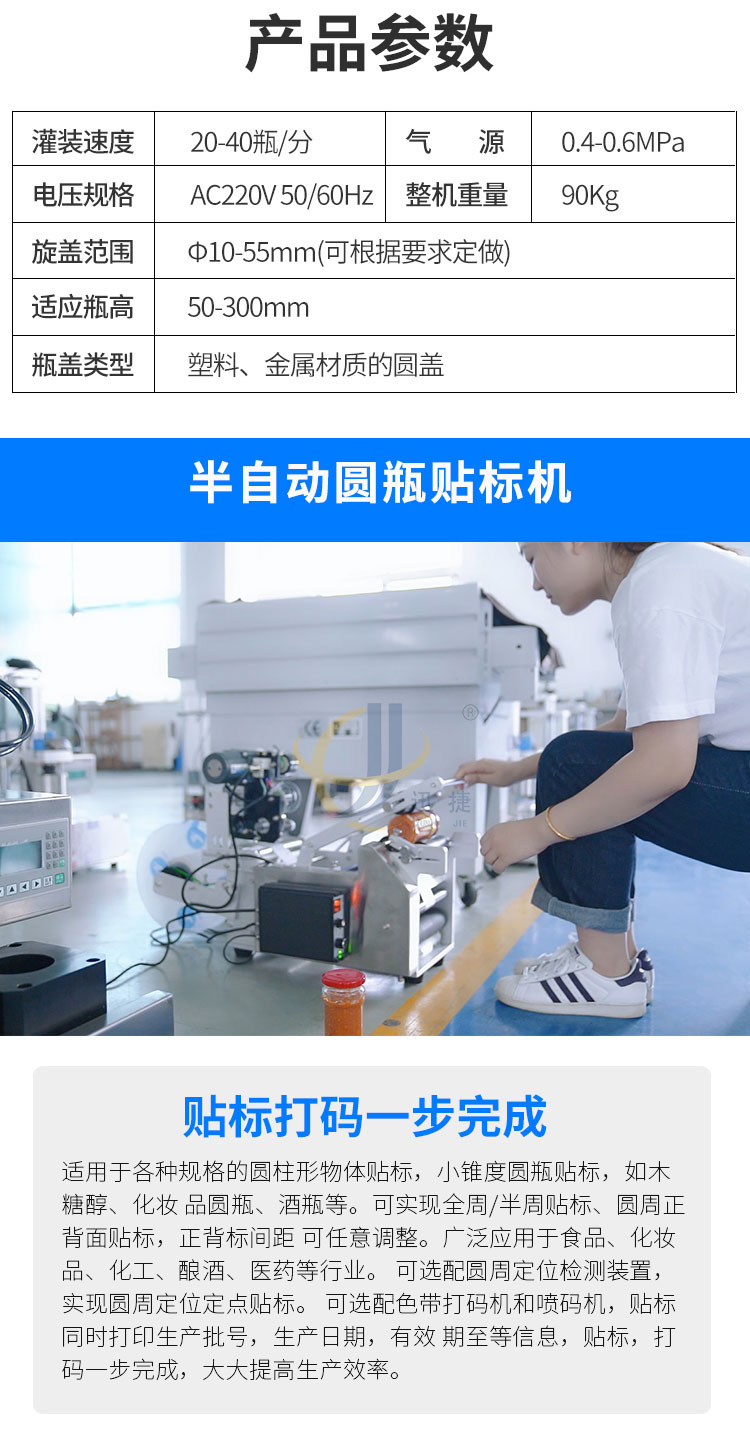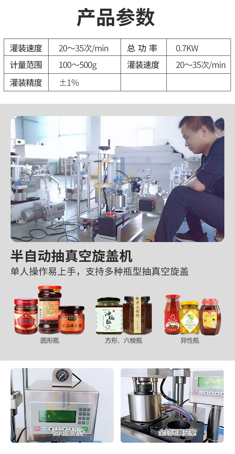 小型酱料灌装生产线又名酱料灌装三??停砂胱远戳瞎嘧盎?半自动真空旋盖机+半自动圆瓶贴标机组合而成。该灌装机适用于辣椒酱、豆瓣酱、大块肉酱等物品的定量充填分装。