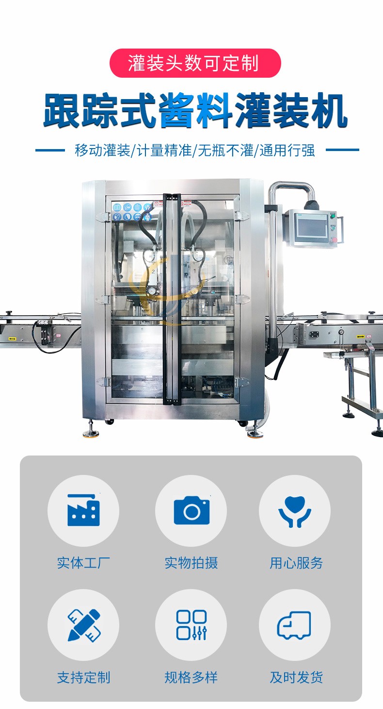 跟踪式调味酱灌装机设备配置定量灌装、定液位灌装两种方式,计量误差2克。定量灌装保证每一瓶的灌装质量。