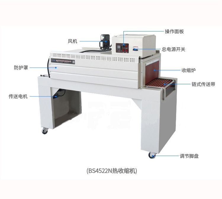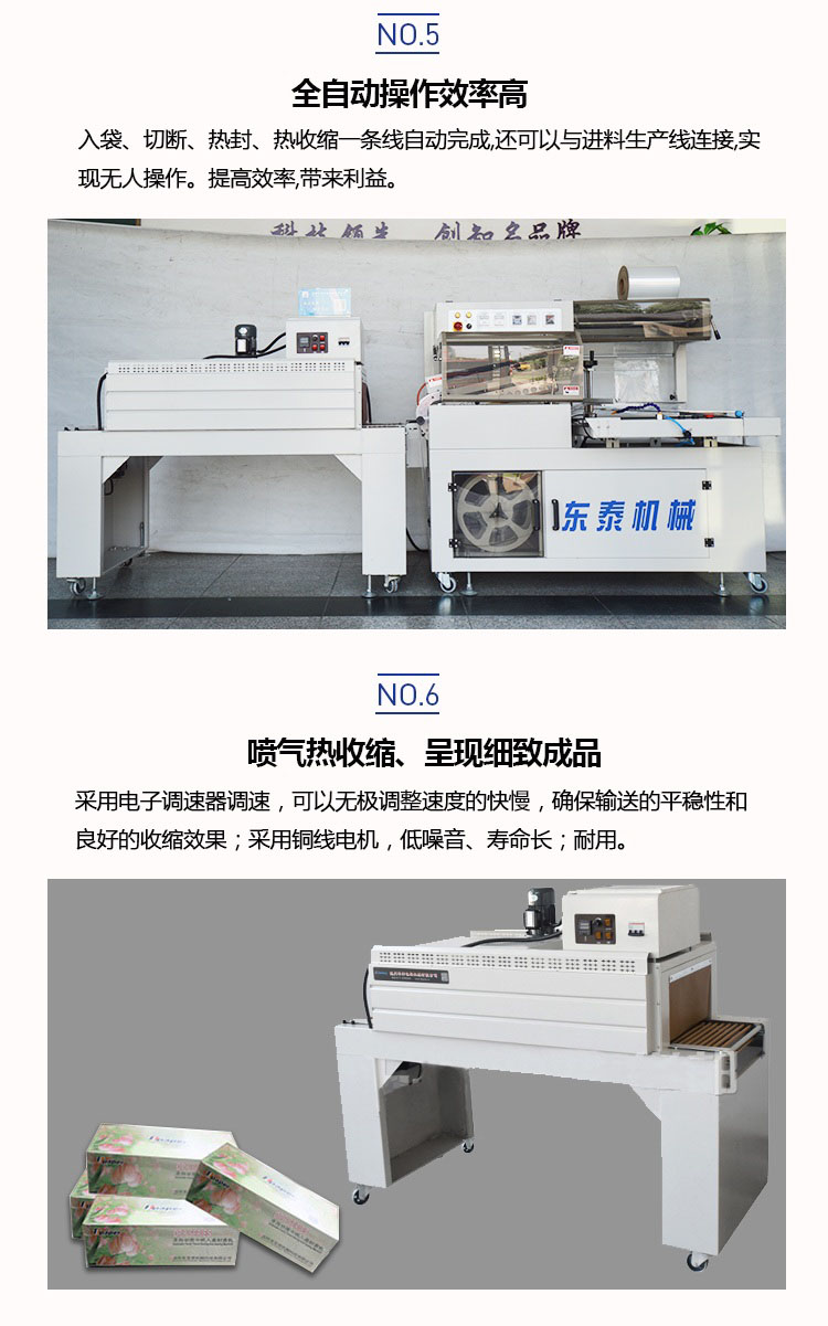 自动塑料膜热收缩包装机结构紧凑占地面积小,非常适合配套自动包装流水线完成产品的自动无人化包装,适合于单个物品包装或有底托物品包装。