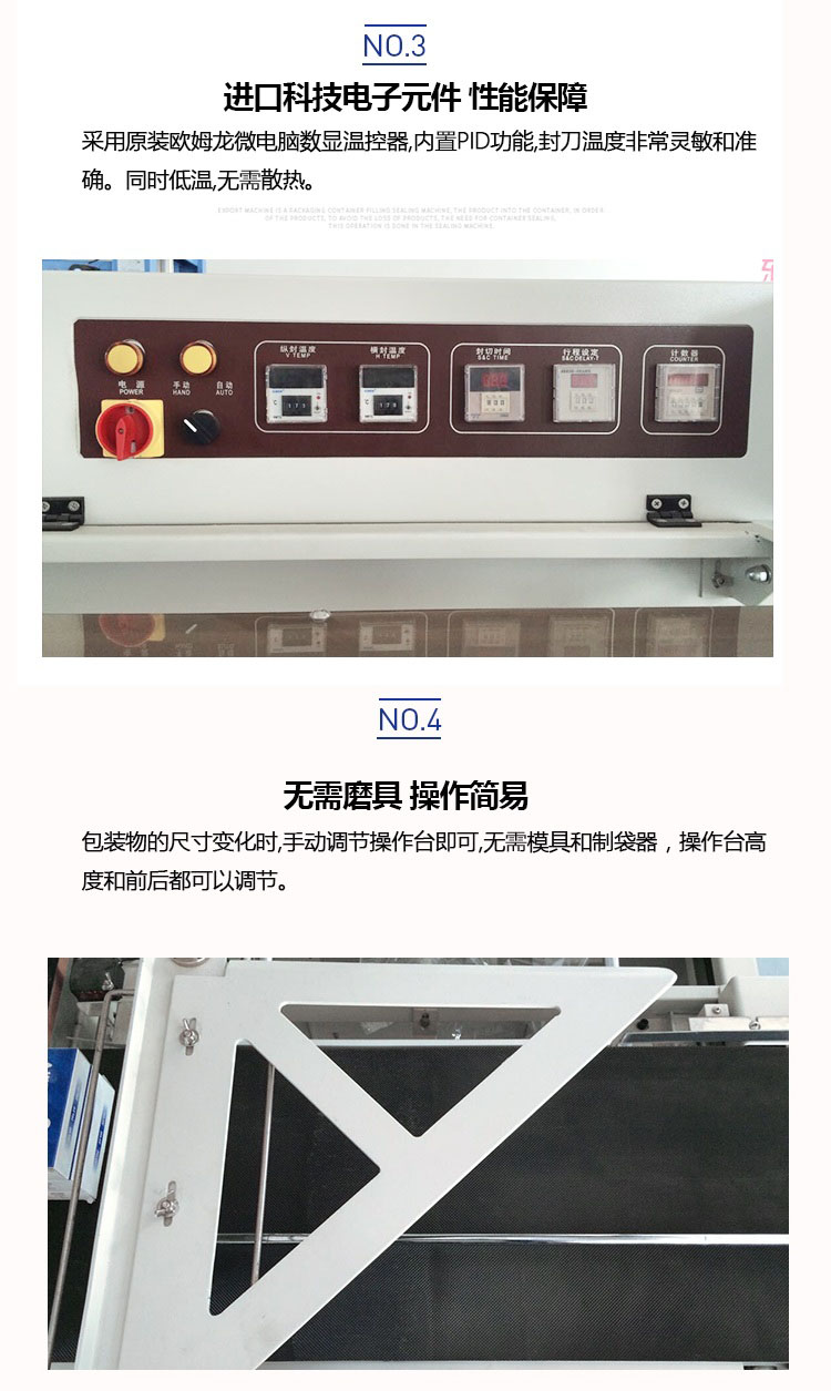 自动送料,长度亦能由光电和计时器的组合,自动调节;配有感应马达,自动卷取废料;当包装物尺寸变更时,调整非常简单,不用换模具与袋器